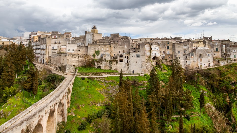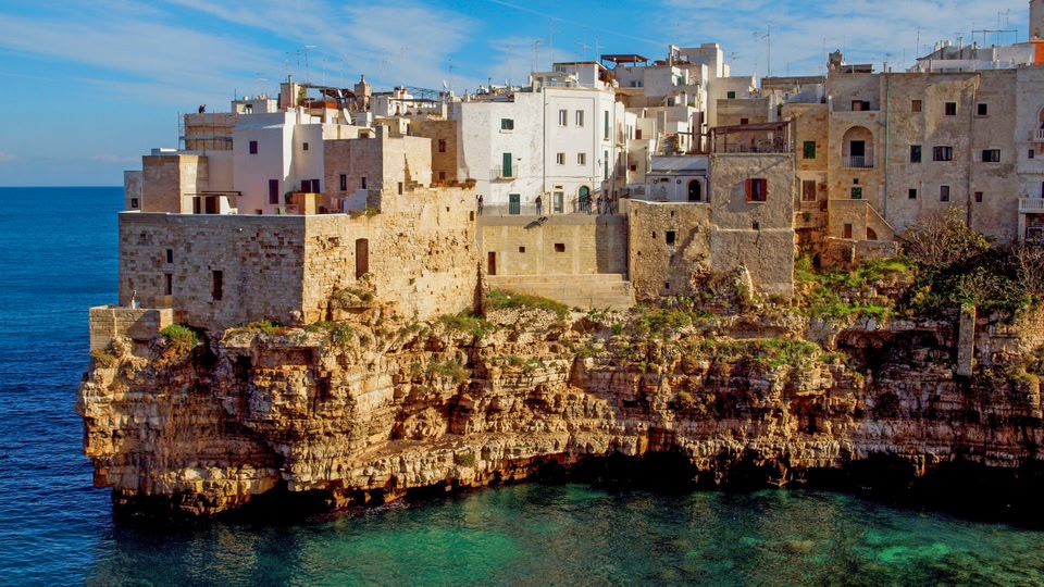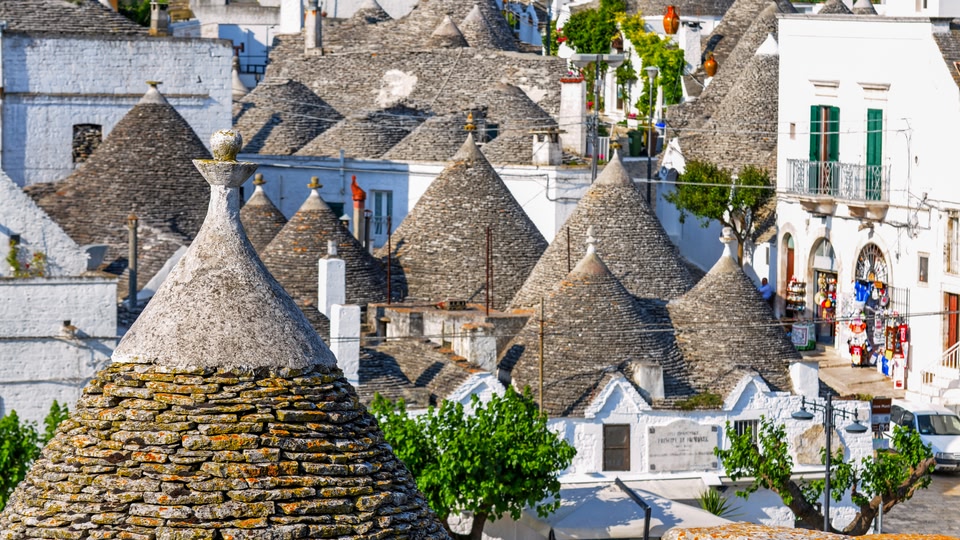 Les célèbres « trulli » (maisons de pierre aux toits en forme de cône) comptent parmi les curiosités les plus emblématiques des Pouilles. Le charmant village d'Alberobello en compte plus de 1 000, dont certains remontent au 14e siècle. Non loin de là, Martina Franca abrite des remparts médiévaux et des églises baroques, tandis que la « ville blanche » d'Ostuni éblouit par ses bâtiments décolorés par le soleil et ses vues imprenables sur l'Adriatique.