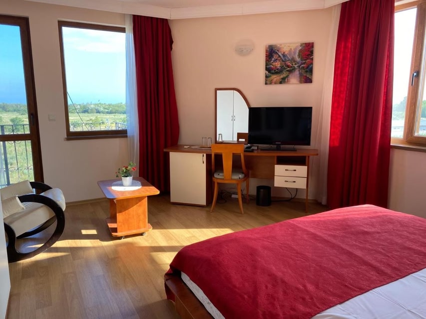Luxurious Amenities and Stunning ViewsIndulge in a stay at Guest House Golden Flake, offering a seasonal outdoor pool and picturesque garden views. Relax in rooms with balconies overlooking the pool, equipped with cable TV and air conditioning.Family-Friendly FeaturesEnjoy a family vacation with kids' pool, play areas, and outdoor equipment. Parents can unwind in the coffee shop, bar, or lounge while children are entertained in a safe environment.Convenient Location and Nearby AttractionsLocated near Bolata beach and Zelenka Beach, our sustainable guest house is also close to Thracian Cliffs Golf & Beach Resort and BlackSeaRama Golf Club. Explore the Palace of Queen Maria just a short drive away.Book now for an unforgettable experience at Guest House Golden Flake 4km from Bolata beach.